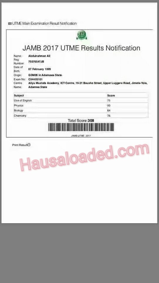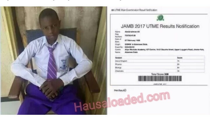 Wani matsahin yaro daga jihar Adamawa, Abdulrahman Ali ya ci maki 308 a jarrabawar shiga jami’a wato Joint Admission Matriculation Board (JAMB) wanda aka kammala kwanan nan.